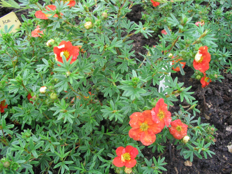Листья эти садовые растения имеют светло-зелёные. Цветёт лапчатка на протяжении всего лета – с июня по октябрь. Оранжевые цветки, небольшого размера, с красным оттенком, выгорая на солнце, становятся жёлтыми, что добавляет ещё привлекательности этому виду лапчатки. Наиболее красивое цветение происходит именно в осенний период.