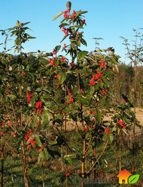 Высота этого растения для сада с гладким стволом серого цвета и декоративной стройной кроной достигает 15 метров. Листья имеют яйцеобразную форму, довольно крупные размеры и темно-зеленую окраску (изнанка листьев окрашена в серебристые тона), осенью она становится красной. Крупные цветки приятного белого цвета появляются на дереве в конце весны. Плоды оранжево-красных оттенков окончательно созревают в начале осени.