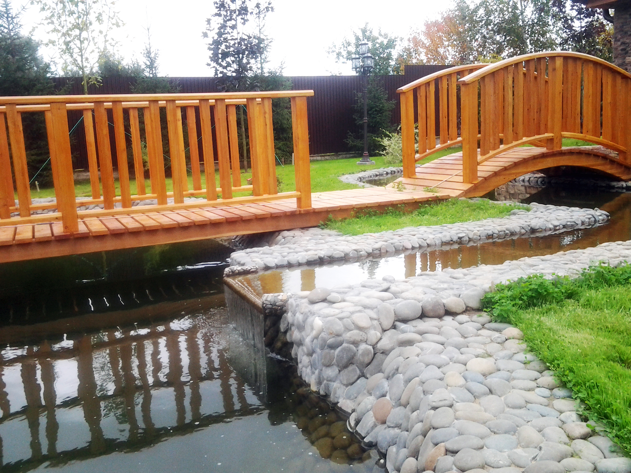 Хозяин поместья в Шишовке хотел иметь собственный пруд, точнее он уже был на территории участка, просто его необходимо было облагородить. Что мы и сделали. Пруд был вычищен от грязи. Вся набережная по периметру была уложена искусственным камнем, что обеспечило ей устойчивость от размытия водой.